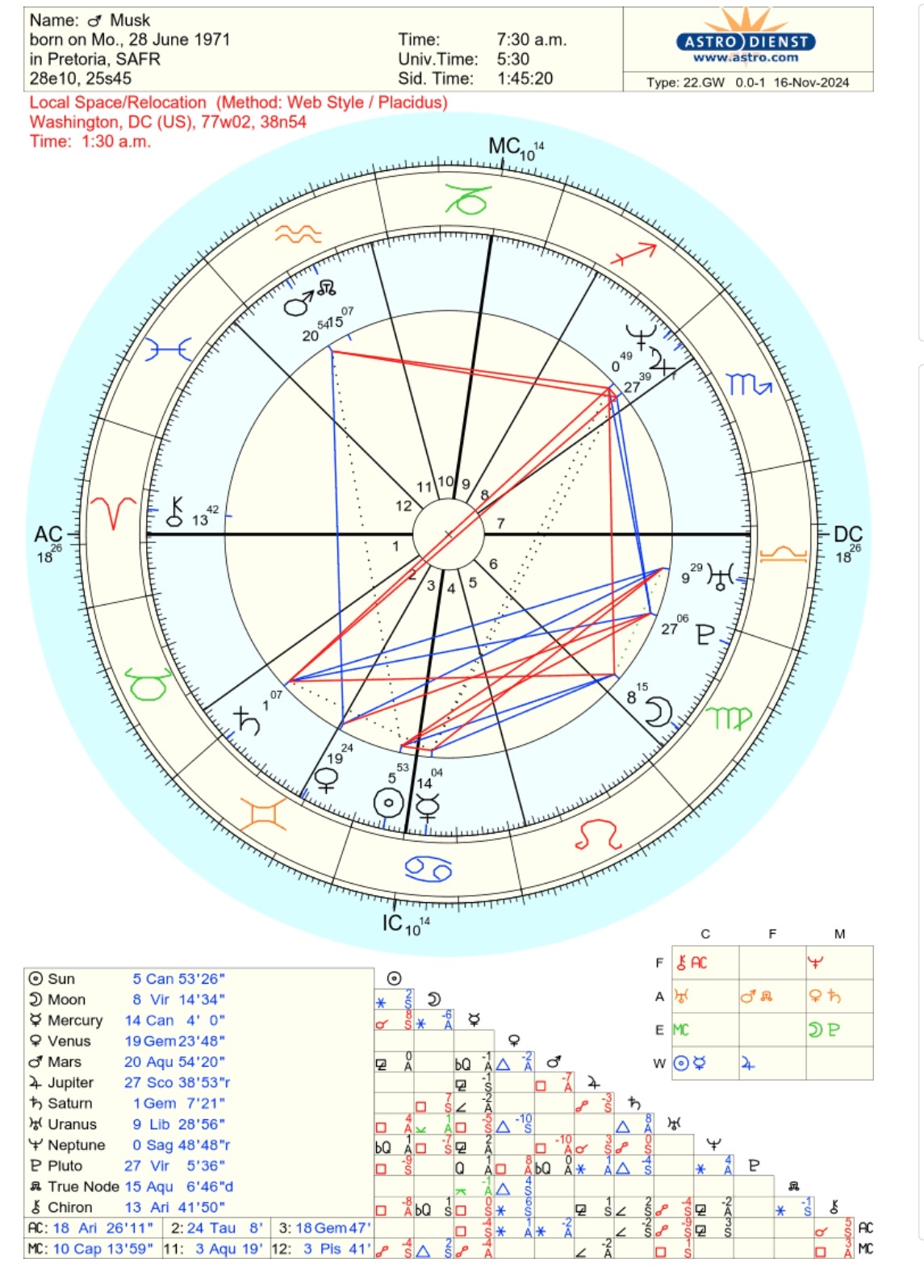 Re: Elon Musk in May 2025 5 by Calli his date of birth would be correct. I suspect his time may be also. SA uses date of birth in the national id number and he would have had one. this would still be on records and too many would have access to rat on him over this. So I think date is solid. I did a relocation to Washington and just as well. the astro.com chart didnt show his Thor's hammer with mars neptune jupiter to sun mercury, but its there …and I suspect he also has a functional grand trine with mars, venus and uranus… both strongly indicated in his life. He was known for his lying as he entered the workforce. grand lying. He activates that Thors when he choses to leverage share price to scam money out of investors for his direct benefit. it works because that mars is part of the grand trine. but look at the relocation to washington with saturn in his 2nd opp neptune jupiter in 8. he is just not going to be in favour. saturn there says little to no influence. what he offers just isnt going to be wanted. we will see…. Attachments IMG_1248.jpeg Viewed 27116 times 448.67 KiB Quote Sat Nov 16, 2024 11:53 am